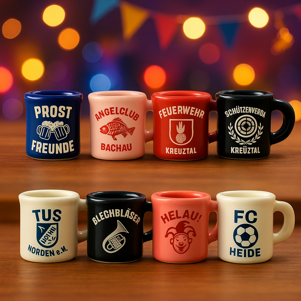 Unsere Schnapsgläser mit Henkel sind das Highlight jeder Kohltour – personalisiert mit Name, Spruch oder Vereinslogo! So weiß jeder, wem das nächste „Prost!“ gehört. Die Gläser liegen perfekt in der Hand, sind stabil und bereit für jede Pause am Wegesrand.